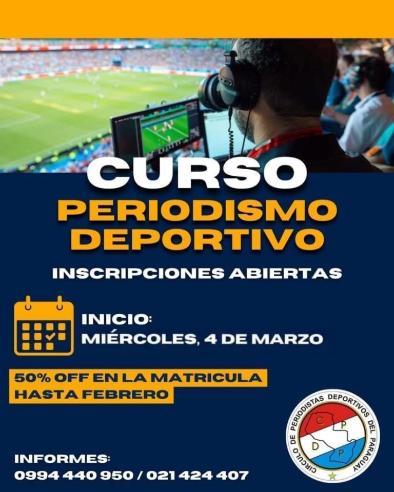 Están abiertas las inscripciones para los tradicionales cursos presenciales de periodismo deportivo, que organiza el Círculo de Periodistas Deportivos del Paraguay (CPDP). Las matrículas para primer y segundo año, con la promoción, son de G. 125 000 hasta fines de febrero. A partir de marzo serán de G. 250 000. Las cuotas mensuales tienen un costo de G. 250 000 …